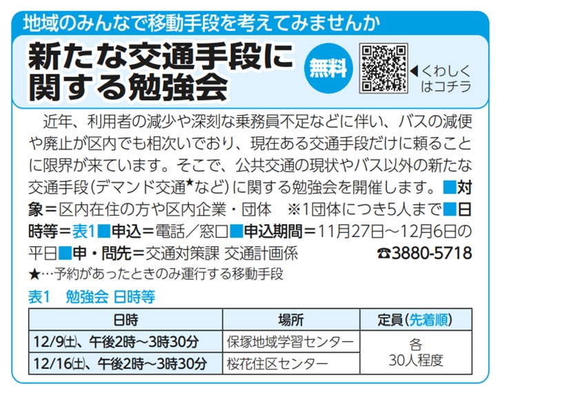 12/9、12/16に開催予定の「新たな交通手段に関する勉強会」の参加申込受付中です。両日とも定員までまだ若干の余裕があります!
