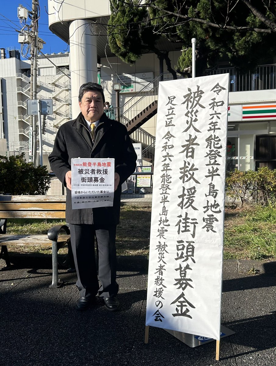 「二十歳の集い」に向かう皆さまに向けたお祝いの街頭活動と一緒に、能登半島地震被災者支援の会の皆様と被災者支援の募金活動を実施😀 #岡本みつなり 衆議院議員も一緒です。募金のご協力に感謝申し上げます。午後は、花畑/保木間2ヶ所でミニ街頭。多くの皆さまに手を振っていただき感謝🙇🏻♂️ #公明党