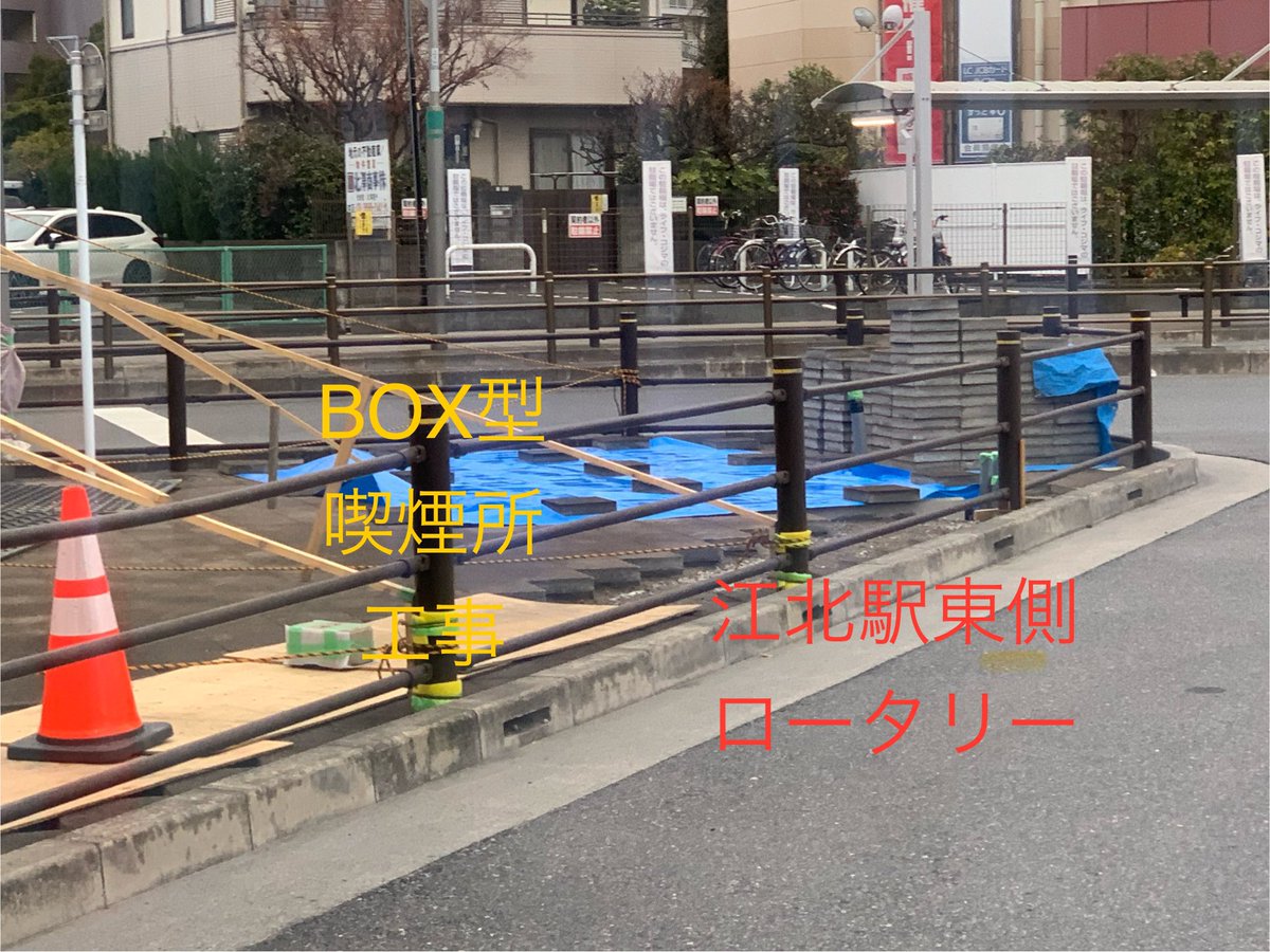 🟢江北駅前では、BOX型喫煙所の工事中、一般開放3月中旬予定です