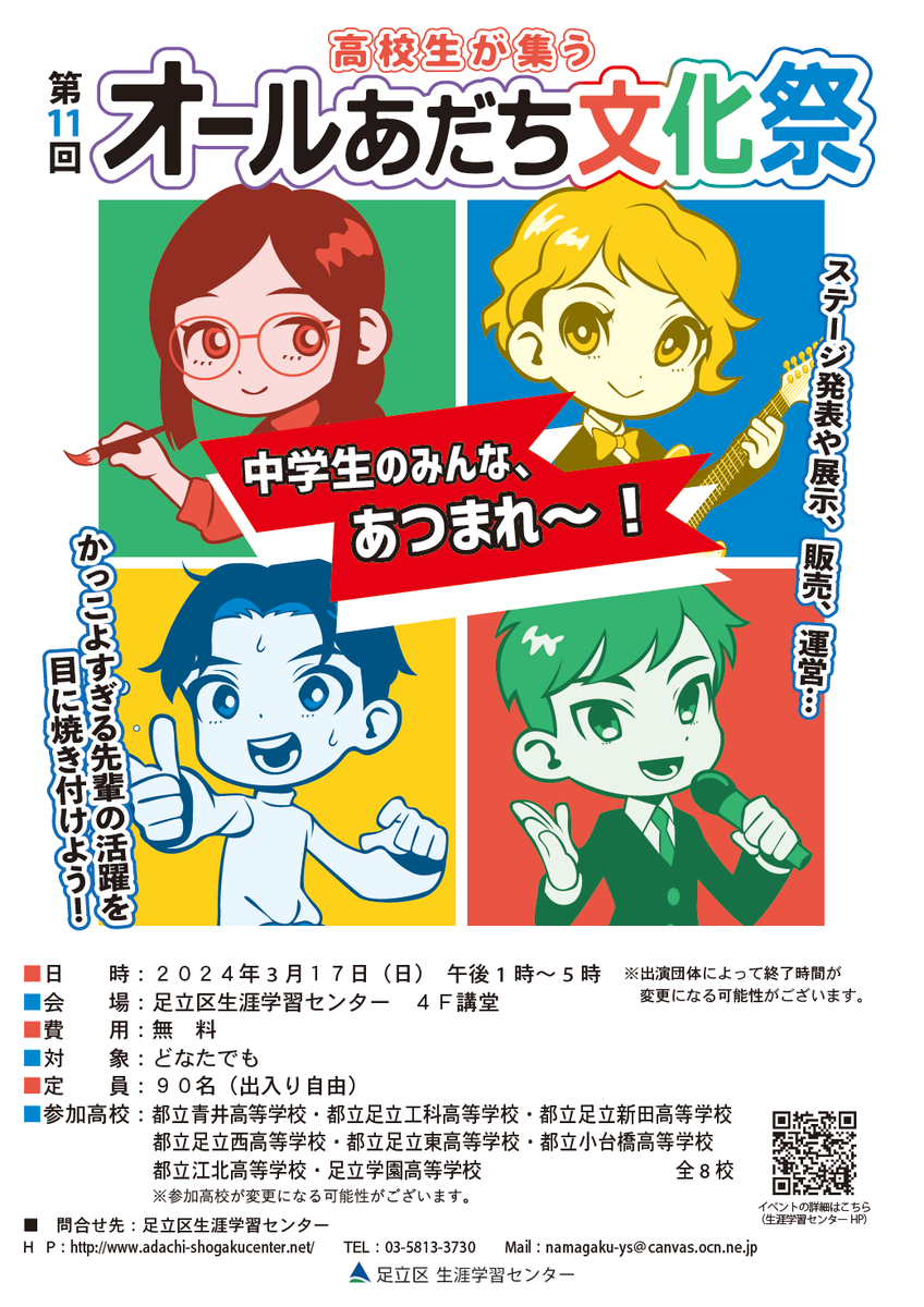 「高校の部活動ってどんな感じなんだろう」「先輩ってどんな人かな」と考えている中学生の皆さん~! 3/17(日) 北千住にで区内高校生の発表の場【オールあだち文化祭】が開催です! 来年の目標に、春から入る高校の先輩を見に、ぜひ見にきてください。