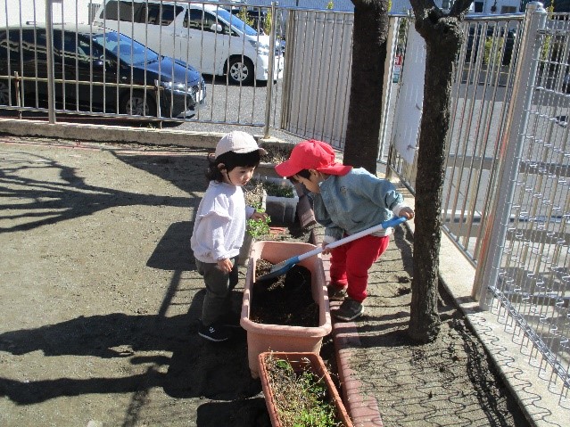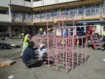 日当たりのよい園庭で様々な年齢の子どもたちが関わりながら遊んでいます。遊びに来てくれたお友だちもジャングルジムに上って楽しんでいます。