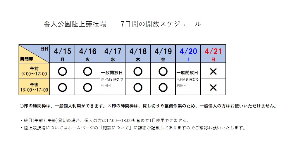 【陸上競技場 予約状況について】 翌1週間分(月~日曜日までの7日間)の個人利用開放日(9時開場~17時閉場)につきまして ・個人利用可能日 〇印 ・個人利用不可日 ☓印 にて記してあります。 詳細は下記HP陸上競技場の項目をご確認ください 。