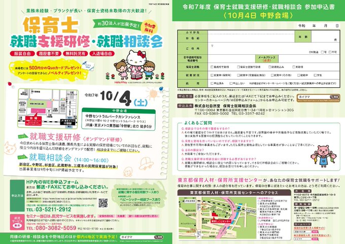 \就職相談会【中野会場】申込受付中/10月4日(土)14:00~@中野セントラルパークカンファレンスにて保育士就職相談会が行われます対象区市の保育園担当者と直接話せるチャンス☆参加無料!履歴書不要!保..