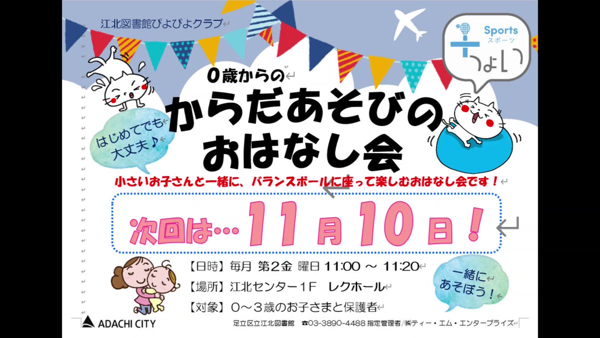 明日、11月10日午前11時~11時20分はからだあそびのおはなし会です🥰0歳から参加できますよ👶🎶#ちょいスポ#あかちゃん向けイベント002