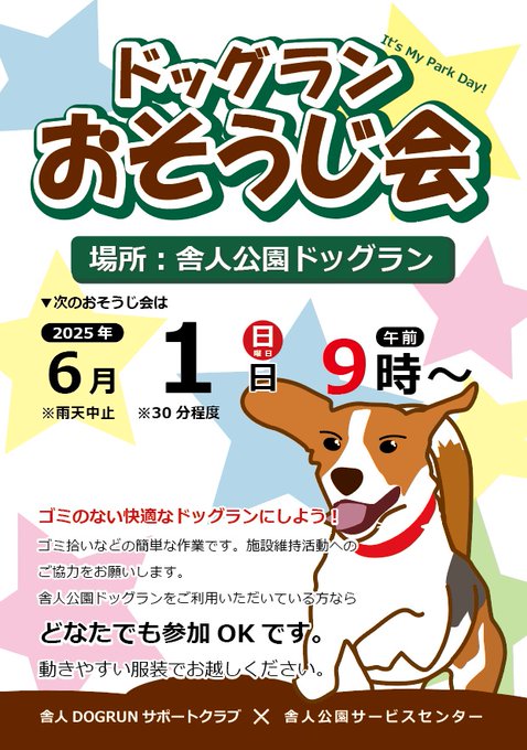 舎人公園ドッグランからのお知らせ 6月1日(日)午前9時より「お掃除会」を開催いたします。お気軽にどなたでもご参加ください。 お待ちしております☆彡 #舎人公園 #ドッグラン