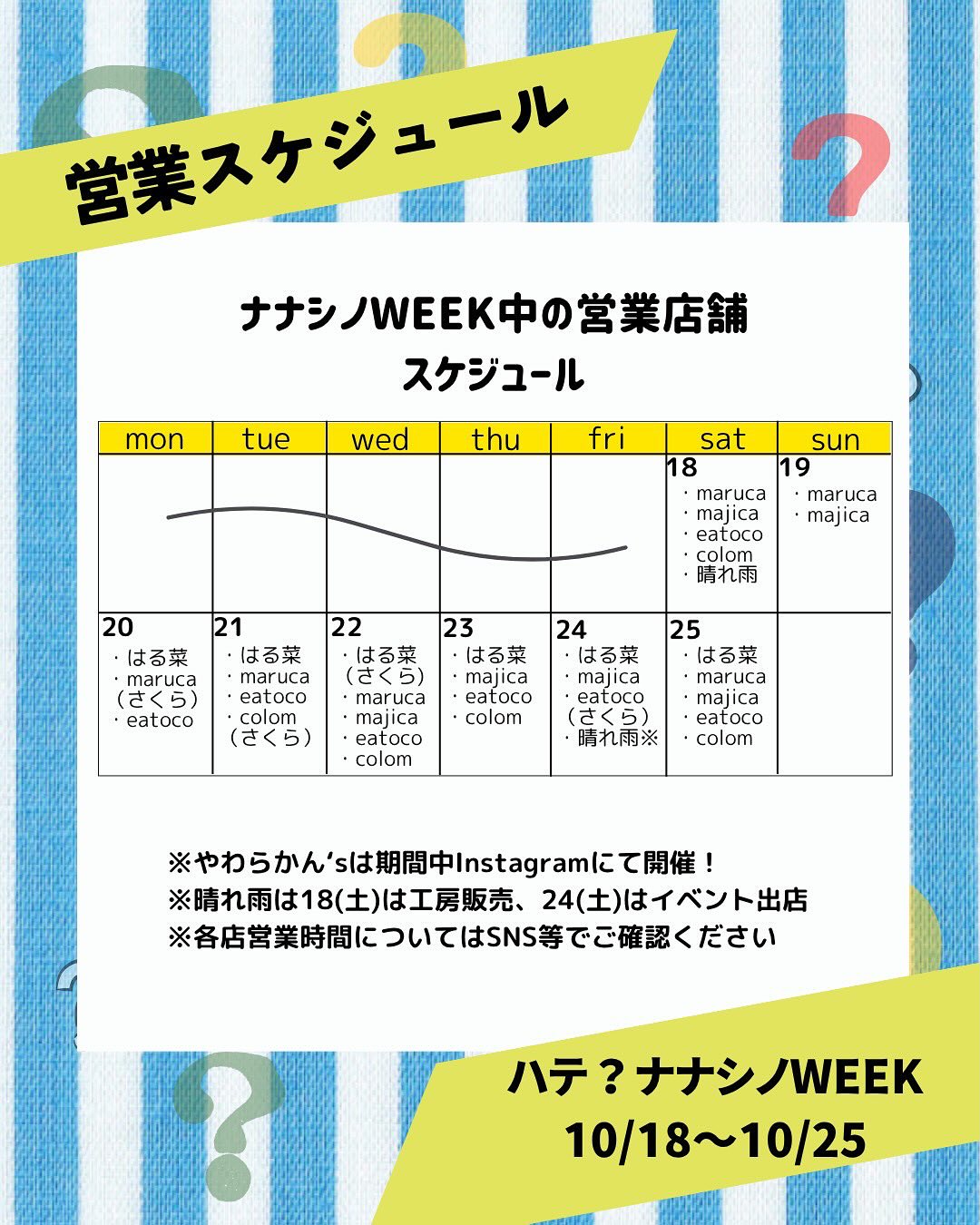 ・\\ハテ?ナナシノWEEK期間中のスケジュール//商店街あげての8日間!営業日や休業日がそれぞれのお..