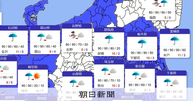 21日にかけ関東甲信で積雪予報、23区も 山沿いで警報級の可能性:朝日新聞デジタル