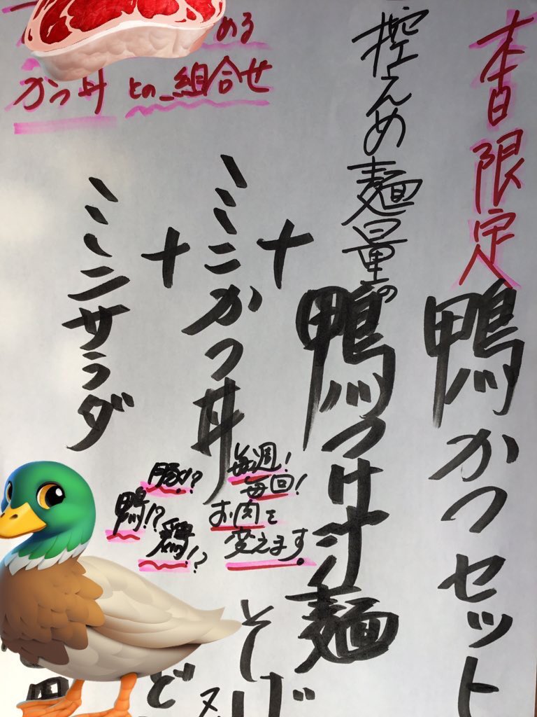 3(木)営業#かつ丼曜日・今回は国産豚ヒレ✨本日限定#鴨カツセット・鴨つけ汁ヒカエメ蕎麦マタハ饂飩とミニカツと🥗楽しんで頂けます様に♪#足立区石臼挽自家製粉手打ち二八蕎麦松月・鴨・辛肉・つけ汁タイプ..