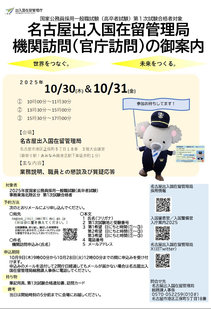 ❖━━━━━━━━━━❖ 採 用 情 報 ❖━━━━━━━━━━❖ 10月30日(木)・31日(金)の2日間 令和7年度 国家公務員採用一般職試験(高卒者試験) の第一次試験合格者を対象とした 機関訪問(官庁訪問)を実施いたします! 詳しくは案内をご覧ください #採用情報 #入国審査官