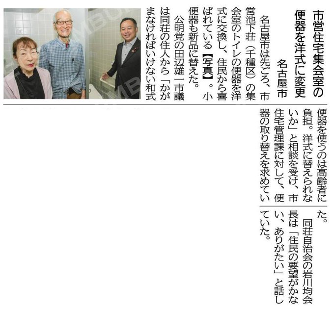 市営住宅集会室の便器を洋式に変更/名古屋市 #公明新聞電子版 2024年07月07日付 https://komei.or.jp/newspaper-app/