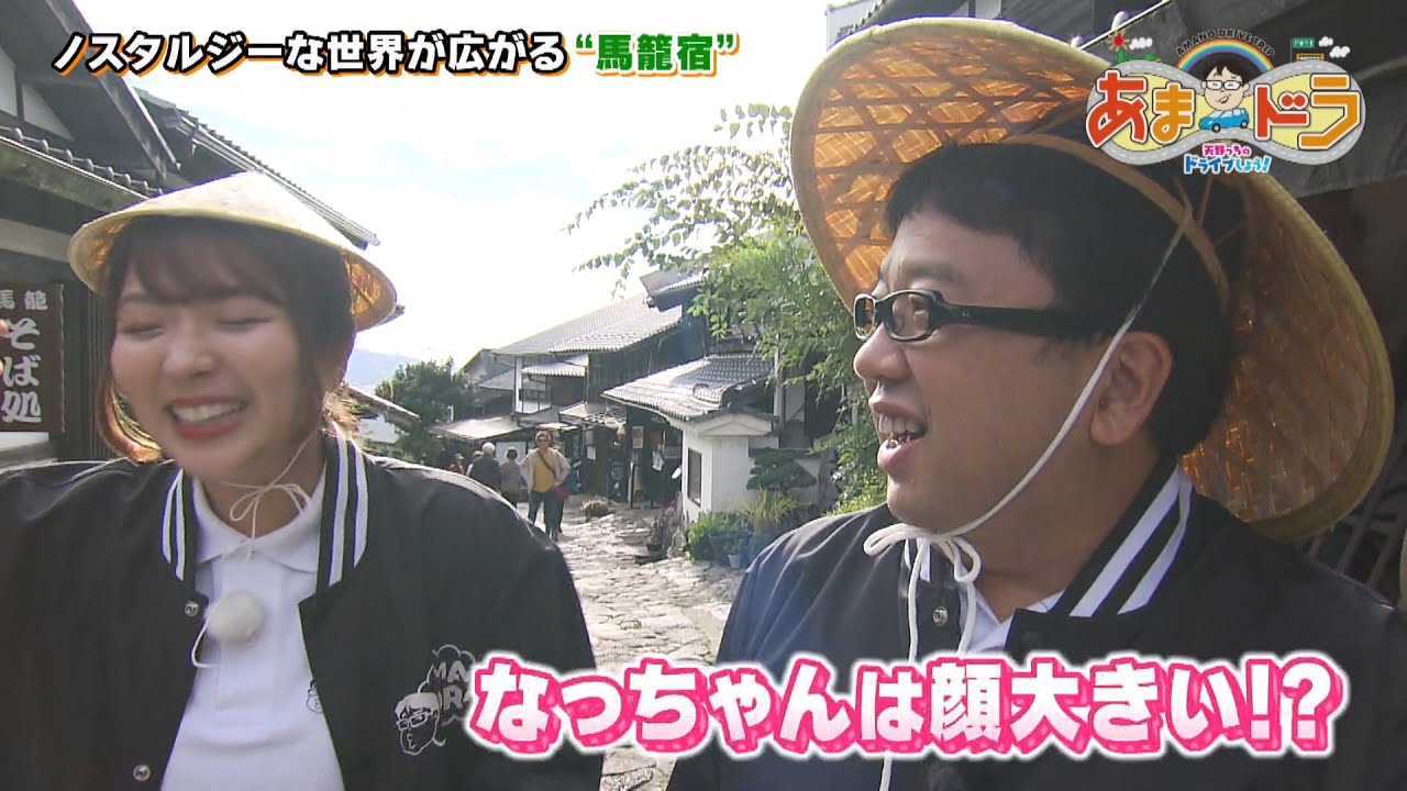 天野っちとなっちゃんは放送100回を記念して、岐阜県中津川市の馬籠宿を訪れます。自然に囲まれた風景と石畳が続く宿場町です。ふたりは雄大な山々と恵那山が目の前に広がる「馬籠 陣場上展望台」で「道中おやき..