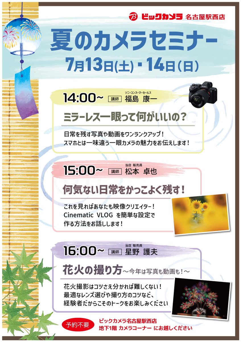 夏の販売員セミナー7/13(土)・7/14(日)の2日間開催場所B1Fカメラコーナー・14時〜ミラーレス一眼って何がいいの?・15時〜何気ない日常をかっこよく残す!・16時〜花火の撮り方夏の思い出を綺..