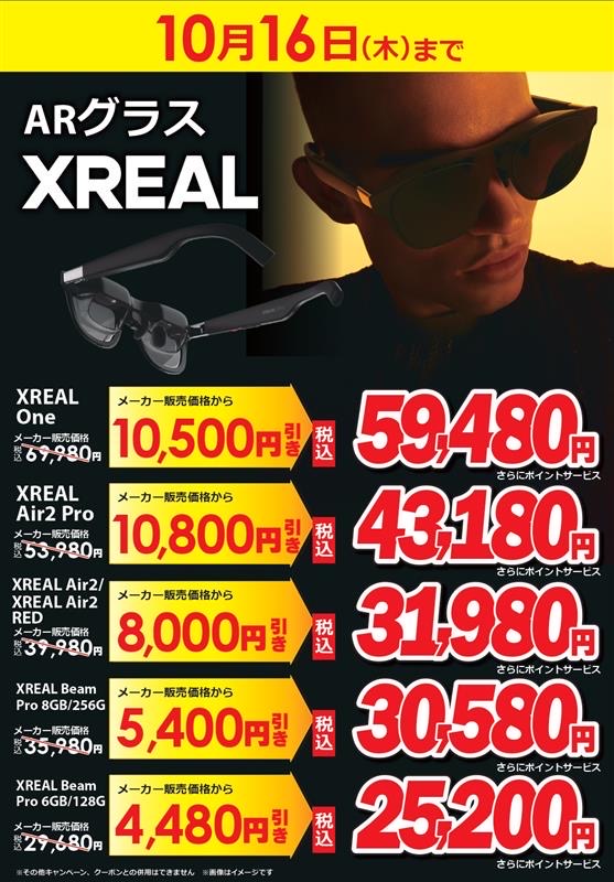 大人気ARグラス「XREAL」を購入するなら今がチャンス10月16日までの期間限定で最大10,800円引きなお得なキャンペーン開催中でございますぜひこの機会に1階携帯コーナーまでお越しくださいませ#X..