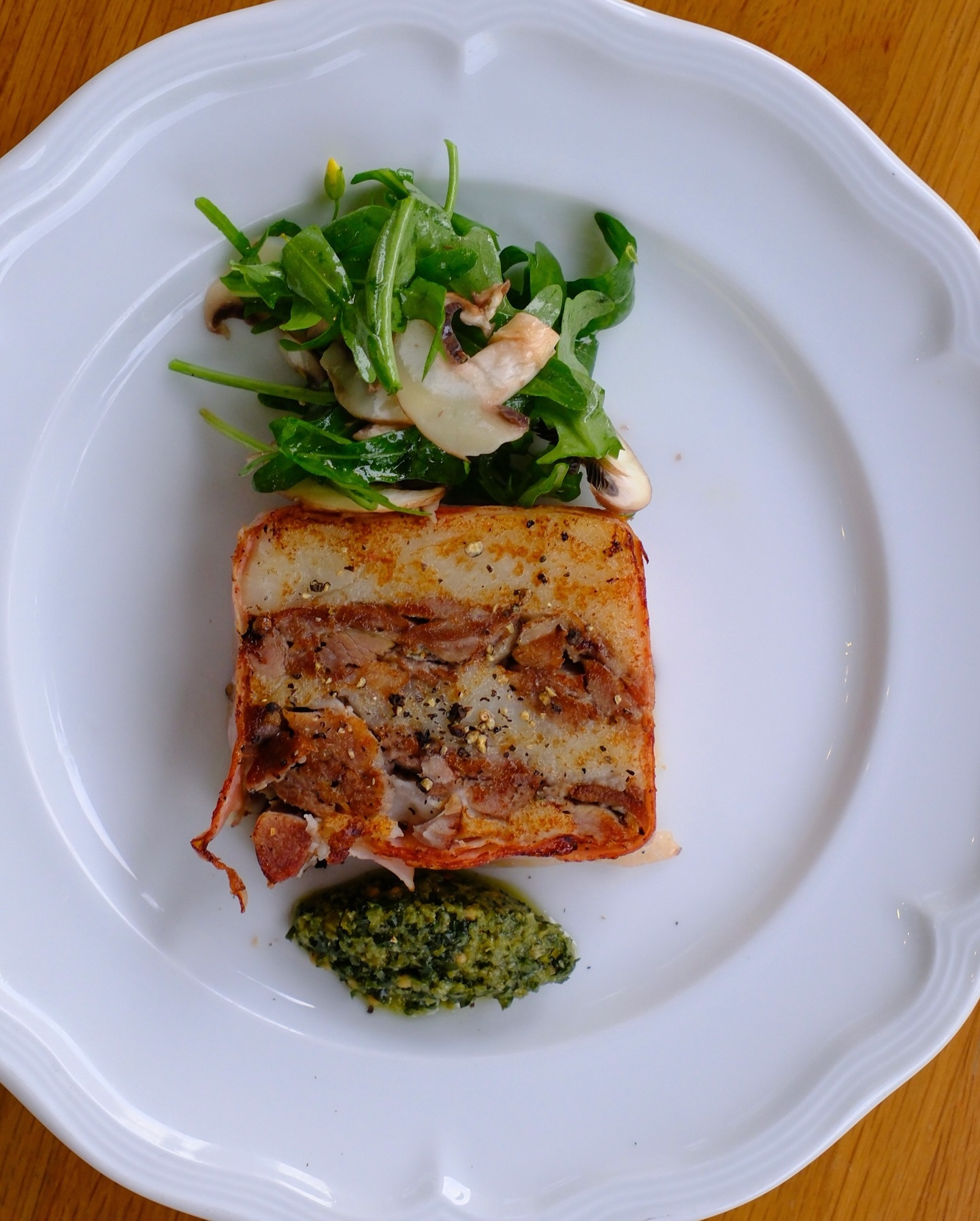 .[鴨モモ肉と里芋のテリーヌ]続々と新しいアラカルトが登場しているので今日はその紹介です。.低温でハーブと優しくコンフィにした鴨肉と香味野菜と白ワインでエチュベした里芋をベーコンで巻いた温かいテリーヌ..