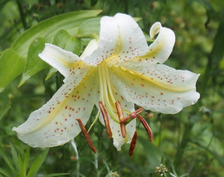 ひときわ目立つ白い花。#日本庭園の池のほとりでヤマユリが咲いています。源氏の庭でも咲いています。日本特産の#ユリで、黄色い筋と紅褐色の斑点が特徴です。#東山動植物園#植物園#ヤマユリ
