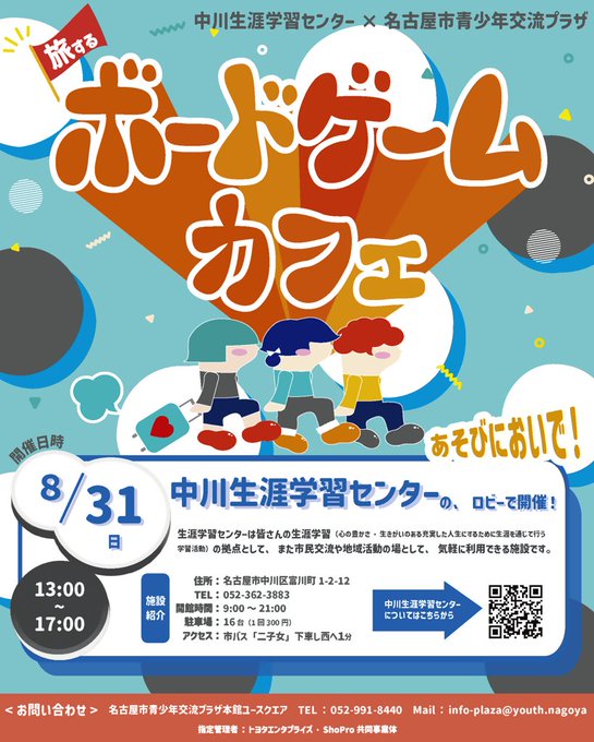 ◥◣ボードゲームカフェが帰ってきた!!◢◤#名古屋市青少年交流プラザがみんなの居場所を広げるために旅をします参加費無料、予約不要、誰でも参加OK近くの生涯学習センターに遊びに来てね詳しくはこちらからh..