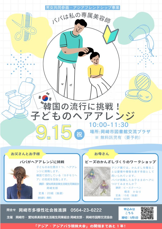 【子どものヘアアレンジ】父親がお子様の「簡単なヘアアレンジ」を学び、母親はかんざしづくりを体験!ご家族全員で楽しめるイベントです日時★9/15(月・祝)10時~11時30分場所★図書館交流プラザかんざ..