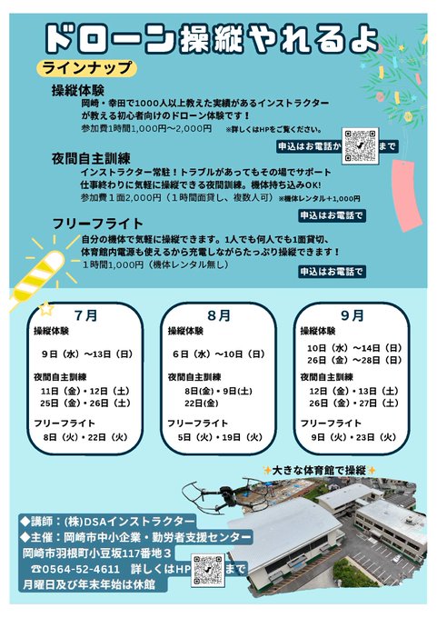 岡崎市中小企業・勤労者支援センターでのドローン操縦のご案内です中勤センターでは、ドローン操縦ができます初心者向けから経験者向けまで、3つのプランをご用意しておりますのでぜひお申込みください!詳細・申込..