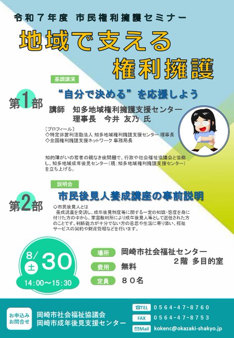 令和7年度 市民権利擁護セミナーのご案内 日時 8月30日(土)14時~15時30分 場所 岡崎市社会福祉センター2階多目的室 参加費 無料 詳しくはチラシまたは岡崎市社会福祉協議会HPをご覧ください。