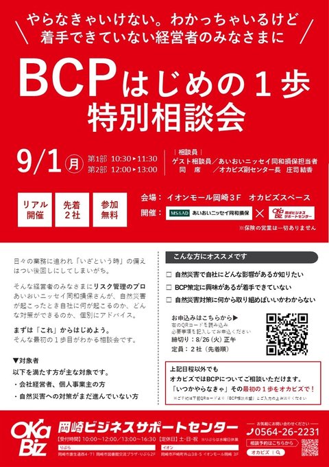 オカビズ・BCPはじめの一歩特別相談会自然災害が起きたときに自社に何が起きるのか、どんな対策ができるのか、個別にアドバイスします。分かってはいるけど着手できていない事業者さん、この機会にご活用ください..