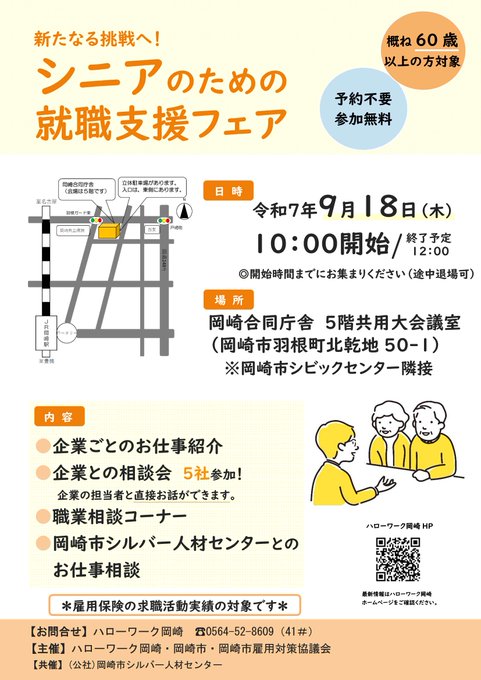 【シニアのための就職支援フェア】高齢者の採用に前向きな企業が参加し、お仕事紹介や企業との相談会を実施します。対象はおおむね60歳以上のかたですが、50代のかたから、何歳のかたでも大歓迎!日時◆9/18..