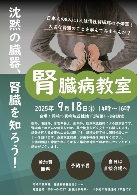 【腎臓病教室「沈黙の臓器腎臓を知ろう!」】医師、看護師など様々な職種から、腎臓病やお食事、お薬、検査を学び、腎臓の働きをもっと知ってみませんか終了後には個別相談会もあります日時★9/18(木)14時~..
