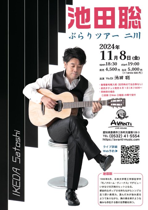 本日8.1(木)18:00より池田聡さんの前売りチケット発売。当日は整理番号順入場となります。同時刻の場合の受付順①AVANTI店頭愛知県豊橋市三弥町元屋敷128-3②Web予約フォームhttps:/..