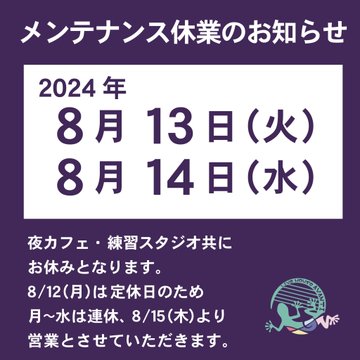 メンテナンス休業のお知らせ8月13日(火)8月14日(水)夜カフェ、練習スタジオ共に、機材メンテナンスの為お休みをいただきます。8/12(月)は定休日のため、月〜水は連休、8月15日(木)より営業とな..