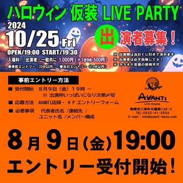 本日19時より、10.25(金)ハロウィン仮装LIVEPARTYの事前エントリー受付スタート。毎年、楽しいハロウィンライブです。出演枠に限りがあるので、エントリーはお早めに!!https://avan..