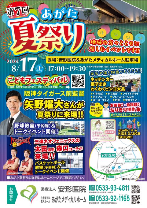 【イベント情報】8/17(土)に開催されるオフィシャルパートナー#安形医院さまの夏祭りに、#太田敦也選手と#森口弥アカデミーコーチが参加いたします17:45から開始予定のトークイベントはどなたでもご覧..