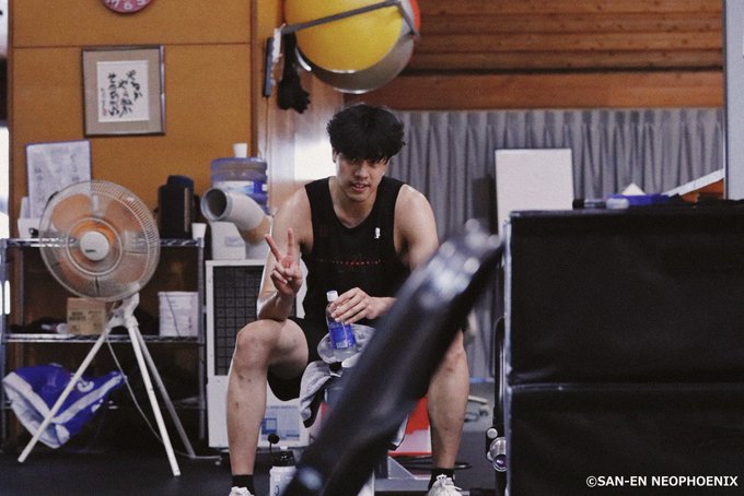 \WELCOMETOPHOENIX/本日の体育館ではトレーニングしている#吉井裕鷹選手の姿も早速ピースいただきました#三遠ネオフェニックス#Bリーグ