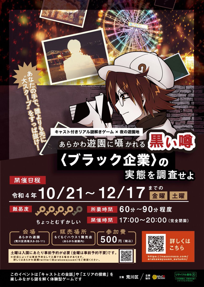 【最終日!】夜のあらかわ遊園にて、キャスト付きリアル謎解きゲーム×夜の遊園地「あらかわ遊園に囁かれる“黒い噂”<ブラック企業>の実態を調査せよ」を開催中!10/21~12/17の金、土曜(17時~20時)※要スマホ #謎解き #あらかわ遊園の黒い噂
