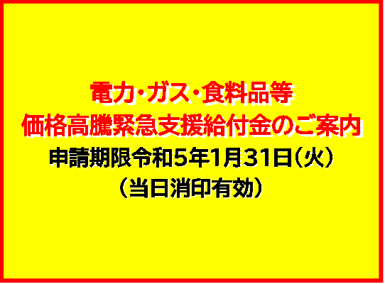 【電力・ガス・食料品等価格高騰緊急支援給付金(1世帯当たり5万円)の申請期限は令和5年1月31日(火曜)(当日消印有効)】