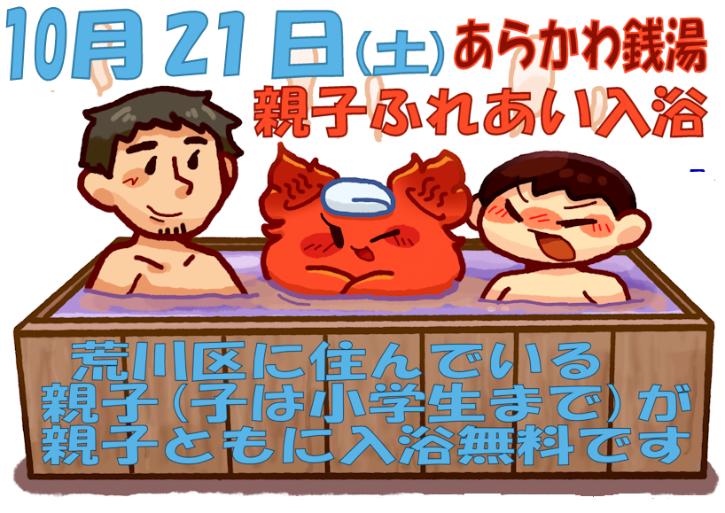 ♨`∇´♨) 10/21(土)は荒川区在住の親子なら #荒川区 の #銭湯 で親子共(子は小学生まで)に入浴無料になる #親子ふれあい入浴 の令和5年度5回目だばーん!無料入浴には親子ふれあい入浴券が必要だけど開催浴場でも用意してるから気軽に来てほしいばーん!