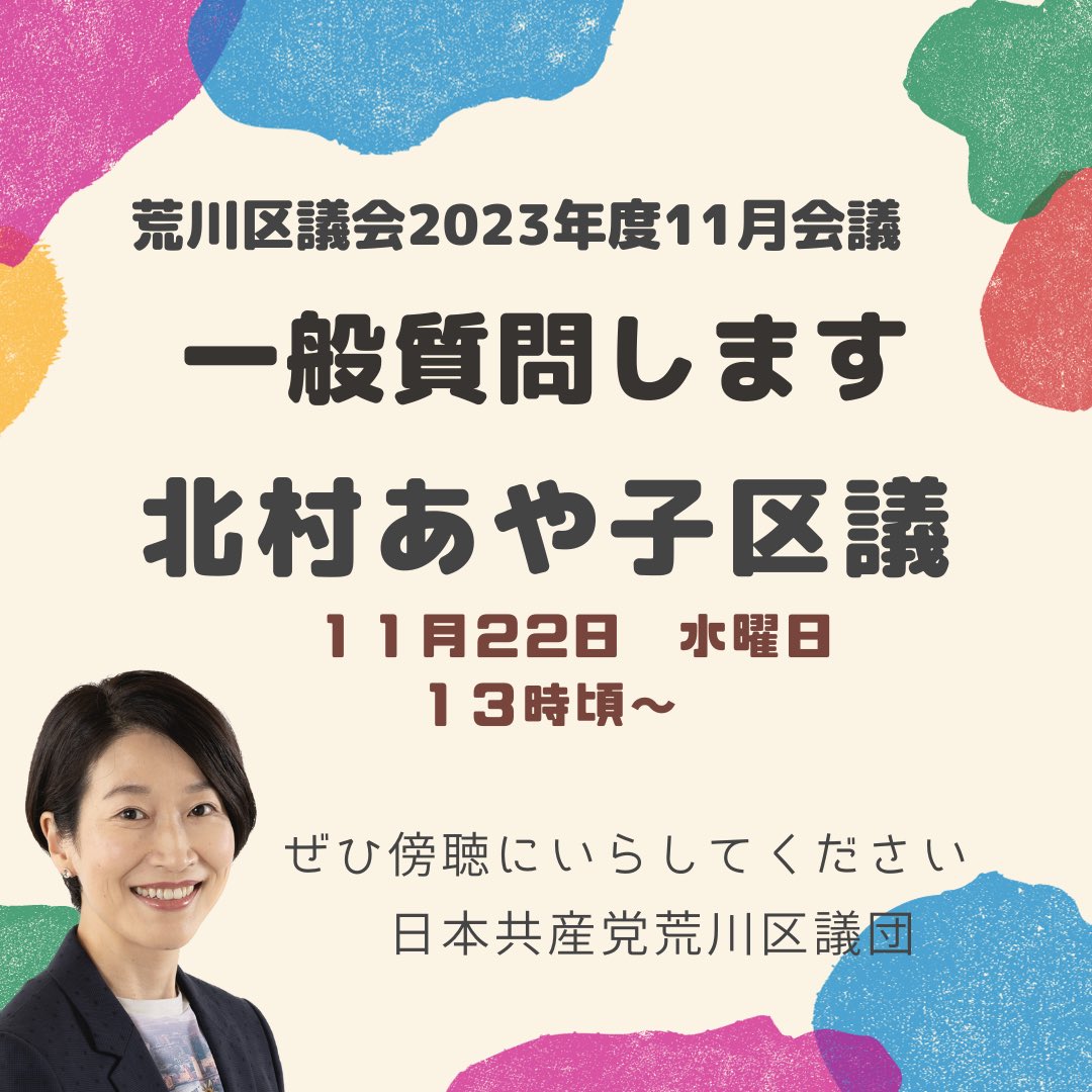 荒川区議会11月会議で本会議一般質問にたちます。 改選後初の質問です。 傍聴できますので、ぜひいらしてください! 11月22日水曜日午後1時頃〜 荒川区役所本庁舎@本会議場 #荒川区 #日本共産党
