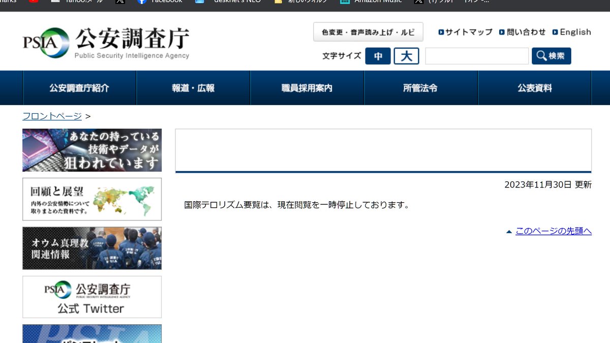 公安調査庁のHPで閲覧できた国際テロリズム要覧2023が、様々なテロ団体の情報を五月雨式に削除した上、とうとう「現在閲覧を一時停止」となりました。…