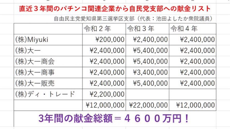 パチンコ関連企業から自民党の支部(代表=池田よしたか衆議院議員)への3年間の献金総額が4600万円です!…