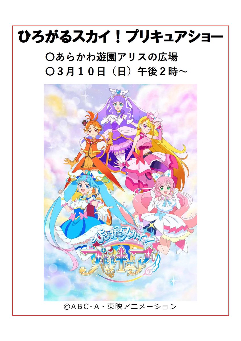 3月10日(日)午後2時から、ひろがるスカイ!プリキュアショーをアリスの広場で開催します!