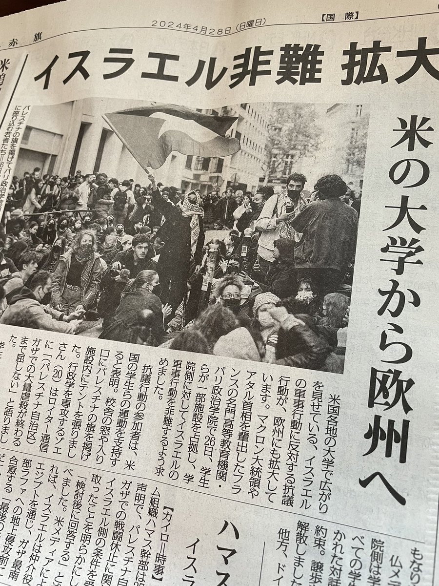 今日の #しんぶん赤旗 日刊紙に、アメリカの大学で広がるイスラエルの軍事行動に反対する抗議行動がヨーロッパにも広がっていることをが報じられています。 荒川区議会からも「パレスチナ自治区ガザ地区の人道危機に対し即時停戦等を求める決議」が採択されています。 1日も早い停戦を。