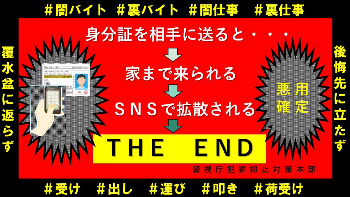こちらは警視庁犯罪抑止対策本部ですバイト・仕事等の募集や口座売買等のツイートに注意してください特殊詐欺等の犯罪に加担して逮捕される可能性があります闇バイト闇仕事裏バイト裏仕事運び荷受け受け出しUD口座..