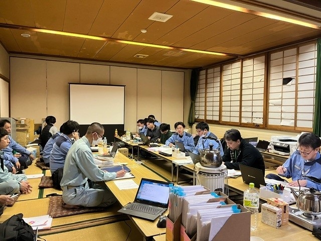 【令和6年能登半島地震への対応】(下水道局)現場での調査が終わった後は、その日のまとめや翌日の調査内容などについてミーティングを行います。ミーティングは夜遅くまで及ぶこともありますが、一日も早い復旧を目指し、これからも力を尽くしていきます。