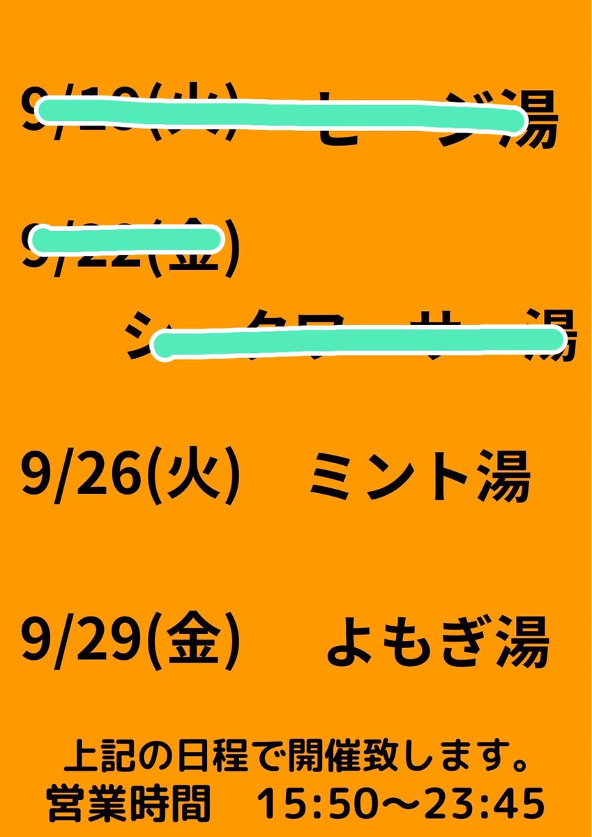 おはようございます☀️#藤の湯です♨️▶本日のかわり湯◀9/26(火)#ミント湯効果:🌿リラックス効果,疲労回復,ストレス解消筋肉痛解消,血流促進効果...etc皆さまのご来場お待ちしております🙌🏻✨..