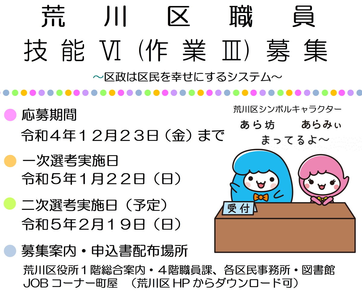 【募集締切まであと1週間!】令和5年4月採用予定の荒川区職員技能Ⅵ(作業Ⅲ)選考の申込受付中です。主な職務内容はごみ収集作業等になります。申込は持参・郵送から可能です。締切は12月23日(金)です。詳..