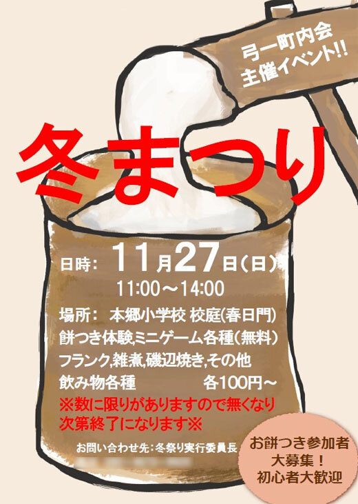 弓一町内会主催イベント!! 冬まつり 日時:令和4年11月27日(日) 午前11時~午後2時 場所:本郷小学校 校庭(春日門) 餅つき体験、ミニゲーム各種(無料