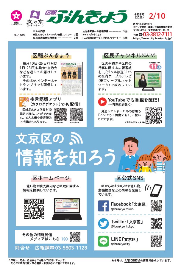 【お知らせ】区報ぶんきょう2月10日号を発行しました。町会・自治会などを通して全世帯へ配付しています。図書館・地域活動センターなど区の施設、区内地下鉄全駅にも配架しています。ぜひご覧ください。
