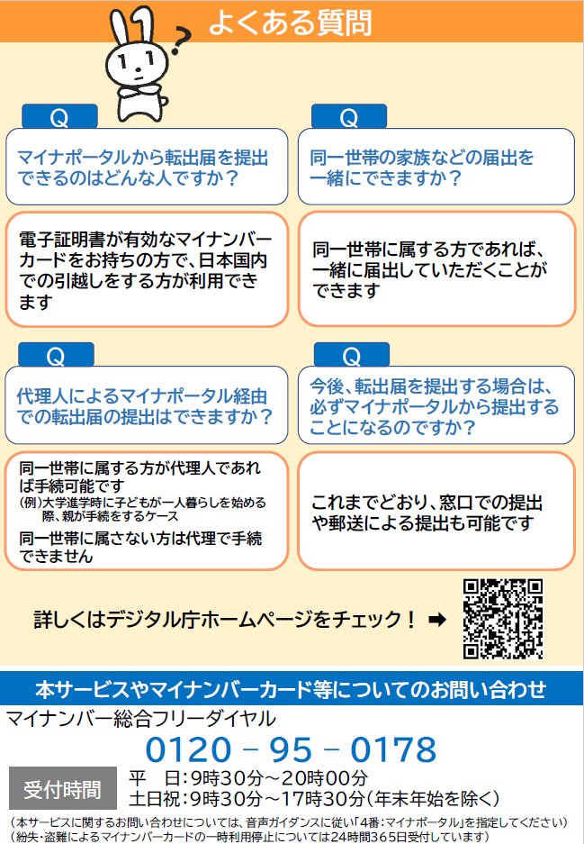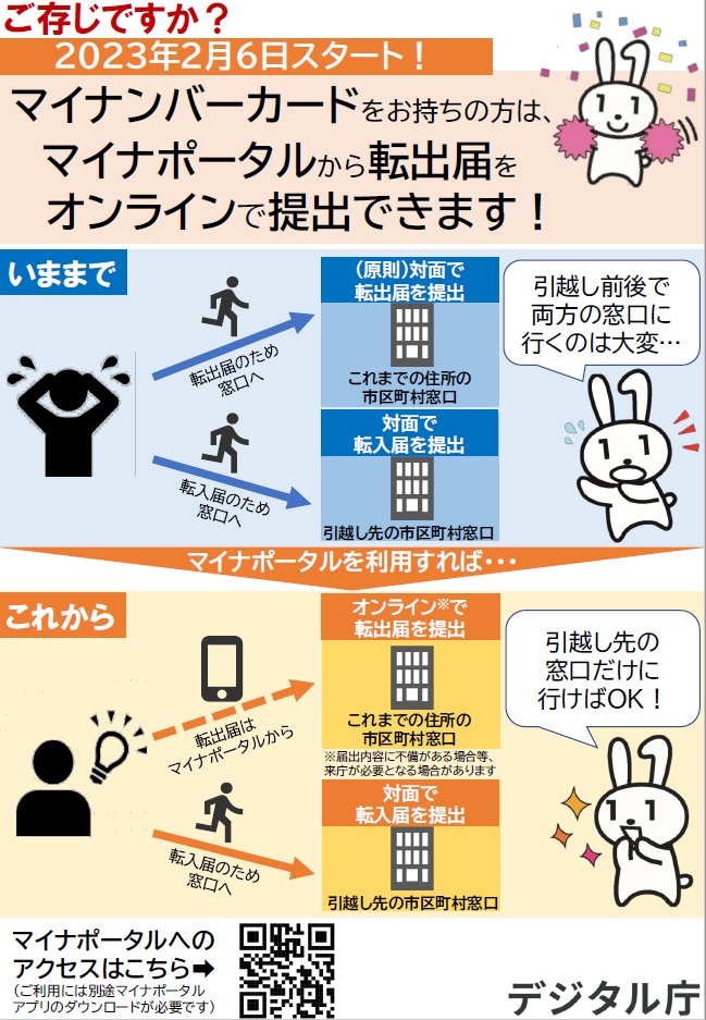 【お知らせ】2/6(月)から引越しワンストップサービスが始まります。マイナポータルのオンライン申請で、転出届の来庁が原則不要になる等、手続きの負担が軽減されます。申請には電子証明書が有効なマイナンバーカードが必要です。