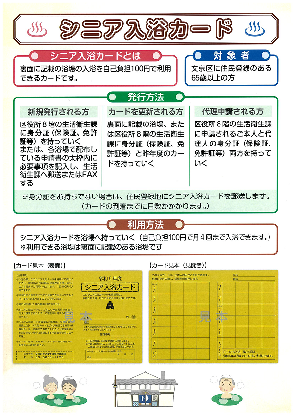 【お知らせ】シニア入浴事業(区内4浴場)「シニア入浴カード」を実施浴場に持参すると、年52回(月4回程度)100円で利用することができます。住民登録のある65歳以上の方が対象です。