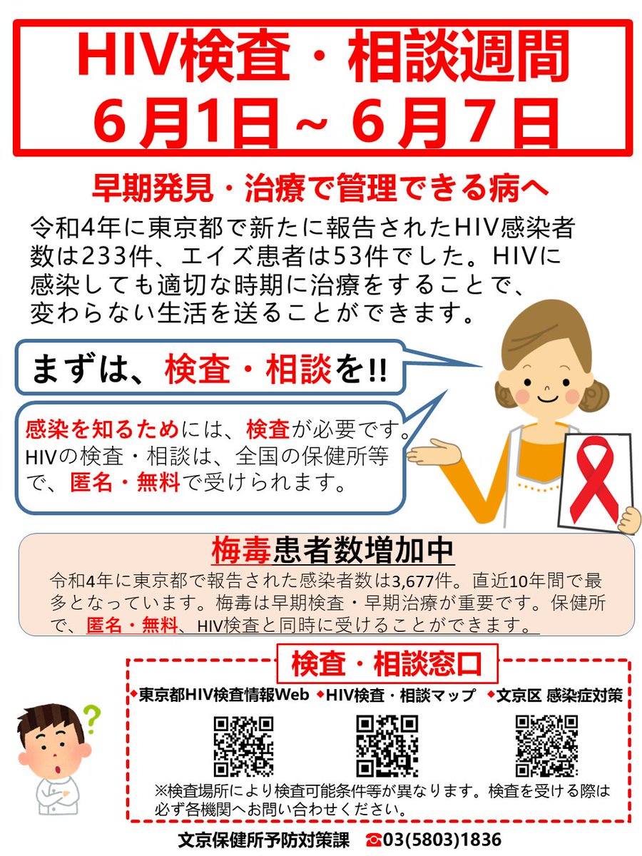 【お知らせ】6/1(木)~6/7(水)は「HIV検査普及週間」です。HIV感染を早く知り、適切な時期に治療を始めることでエイズ発症を防ぐことができます。自分や家族、パートナーの健康を守るため、不安なことがあれば検査や相談を利用しましょう。