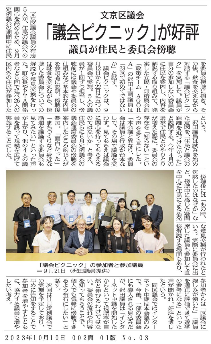 「文京区議会/「議会ピクニック」が好評/議員が住民と委員会傍聴」ーー都政新報(2023年10月10日号、2面)に掲載されました。