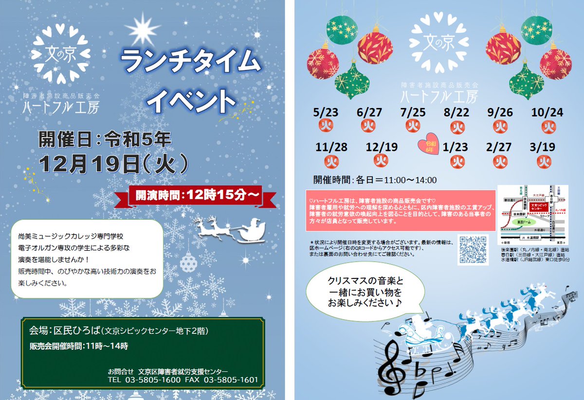 【イベント】12/19(火)の11~14時、シビックセンター地下2階区民ひろばで「文の京ハートフル工房 障害者施設商品販売会」を開催します。尚美ミュージックカレッジ専門学校による電子オルガン演奏と一緒にクリスマスや正月祝いのお買い物をお楽しみください。www.city.bunkyo.lg.jp/hoken/..